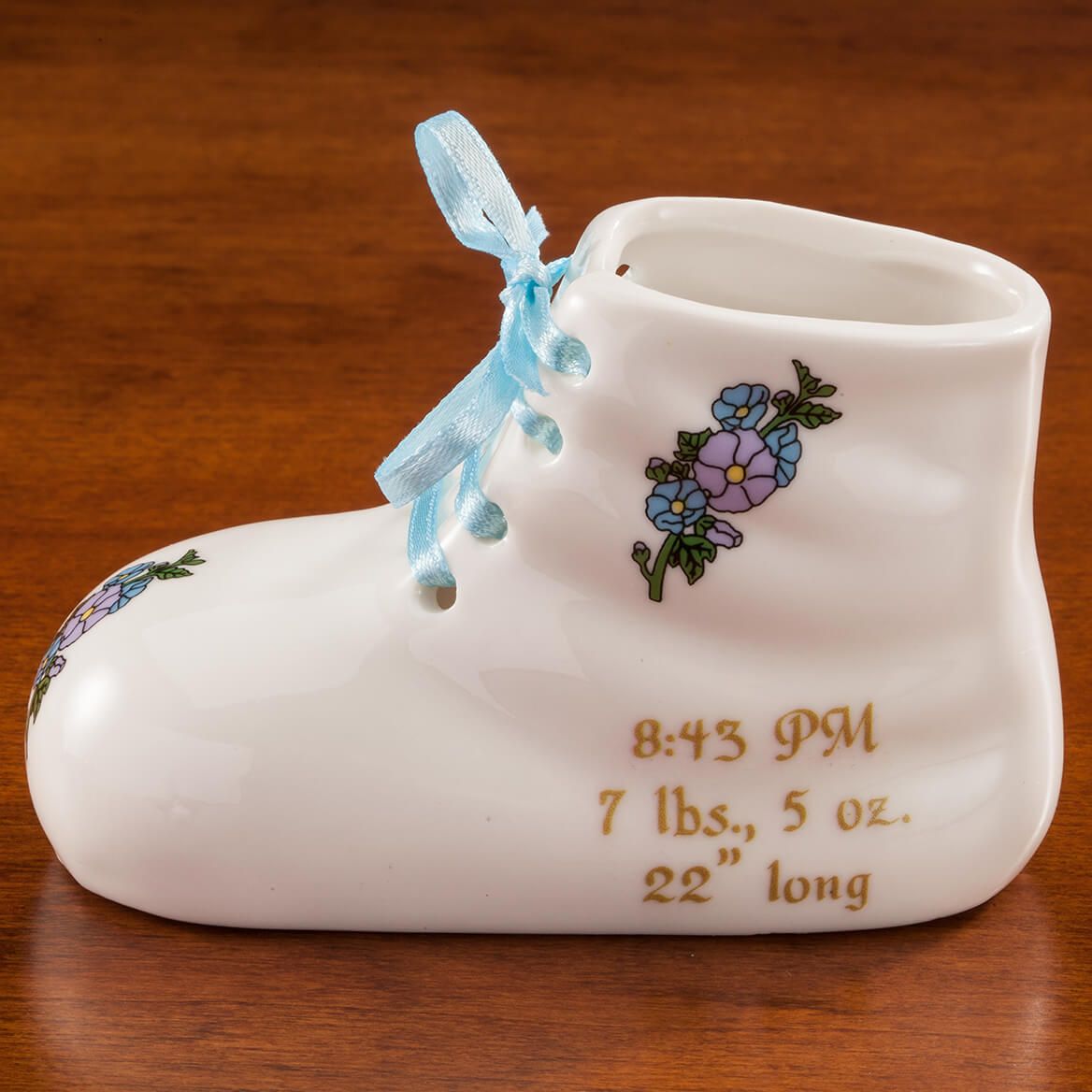 - Treasured heirloom bootie has baby’s birth record in golden letters! Porcelain 4" long x 2" wide x 2 1/2" high bootie has pink ribbon for girl, blue for boy. Specify name and date, limit 2 lines, 18 characters each. Specify time, weight and length, limit 3 lines, 18 characters each.