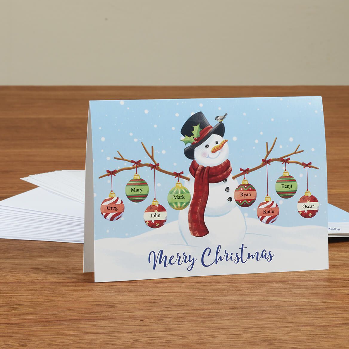- Send a "Merry Christmas" with a Personalized Snowman Family Card naming each member of your family. Specify names listed on ornaments; limit 10 names, 12 letters/spaces each. Specify inside message; limit 3 lines; 50 characters each. Set of 20 holiday greeting cards. Each holiday card measures 4 1/2" x 6 1/4". Envelopes included.