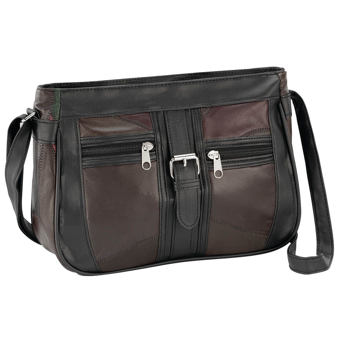 - Casually sophisticated Black Multi-Color Patch Leather Shoulder Bag elevates any look. You'll love the high-fashion details like contrast leather, silver-tone hardware and a decorative faux buckle. This women's purse helps you stay organized on the go with 2 front zip pockets, a back zip pocket and an inside zip pocket. The perfect size for any occasion, the strap drop adjusts 10 1/2"-23 1/2" for carry versatility. Leather handbag is approx. 10 5/8" wide x 7 5/8" high x 3 1/2" deep. 60% sheep leather/40% PVC. Wipe clean.