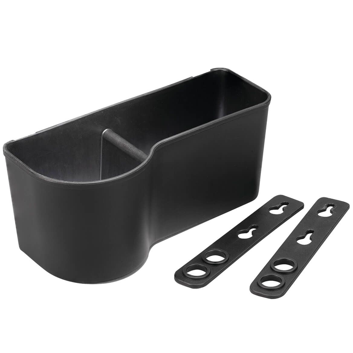 - Keep beverages, snacks and travel essentials handy in this sturdy organizer that clips conveniently onto front seat headrest. Perfect for back seats that don't have cup holders, it's great for organizing and holding a water bottle or coffee travel cup, fast-food beverage, smart phone, snacks, children's toys, baby bottles, juice boxes and more. Designed in durable, easy-clean plastic, the sturdy car back seat organizer features two adjustable plastic straps which easily fit most vehicle headrests. The Car Headrest Organizer utilizes unused space to organize backseat clutter, and makes long road trips or everyday commutes more comfortable — keeping food and beverages neatly contained and within reach. Overall size is 7 1/2" x 7 2/3" x 3 1/3"; bottle holder measures 3 1/2" x 3 1/3" x 3 1/8"; storage section measures 2 1/2" x 4" x 3 1/8"; straps measure 1" x 5 1/4" each.