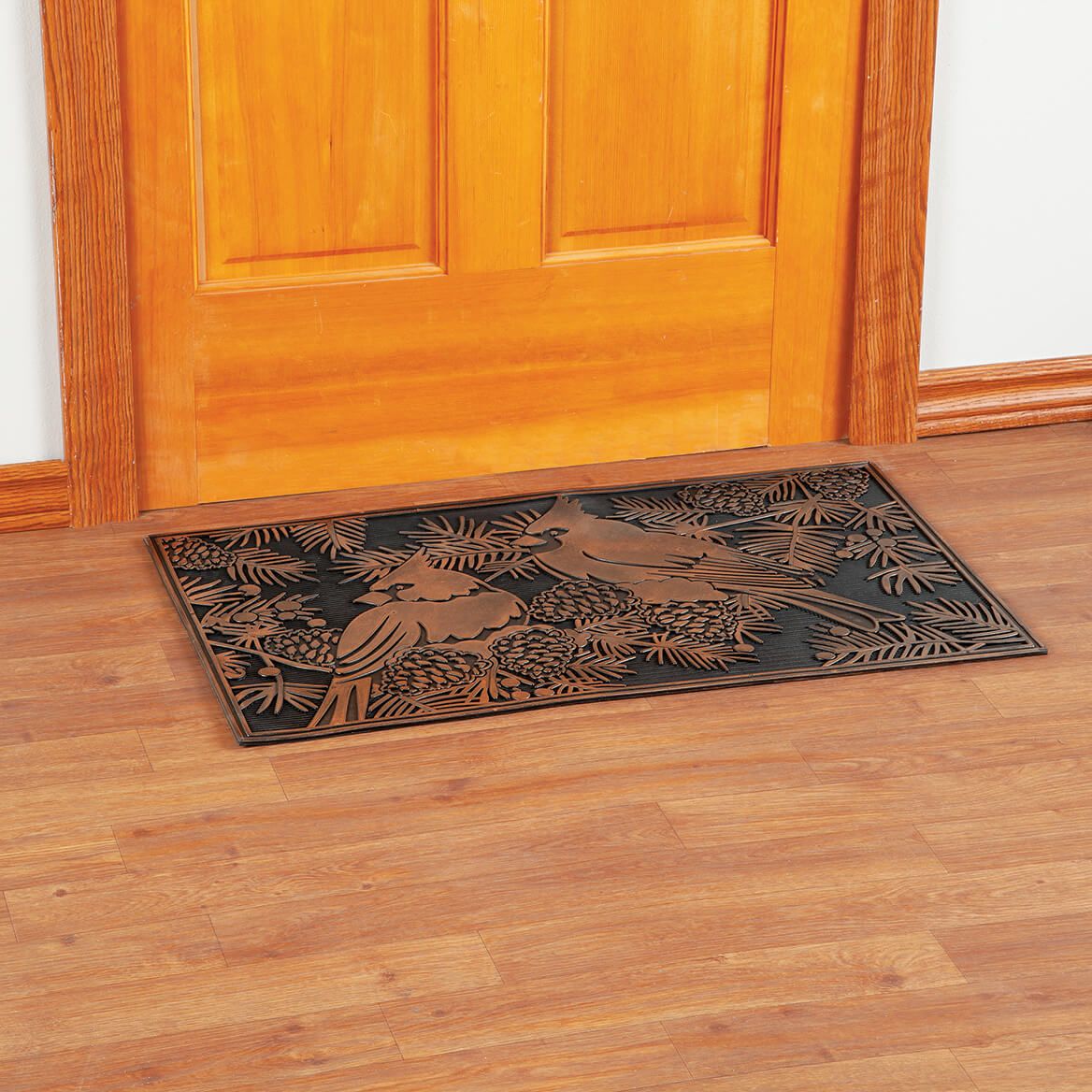 - This Cardinal Gold Finish Door Mat's striking gold on black lends sophisticated style to your entryway. Its stunning depiction of cardinals perched on detailed pine boughs elegantly welcomes guests, while its texture cleans their shoes as they walk through the door. Mildew-resistant, anti-slip rubber is durable for year-round outdoor or indoor use. Welcome doormat weighs 4.2 lbs. Sweep or shake to clean. 18" x 30".