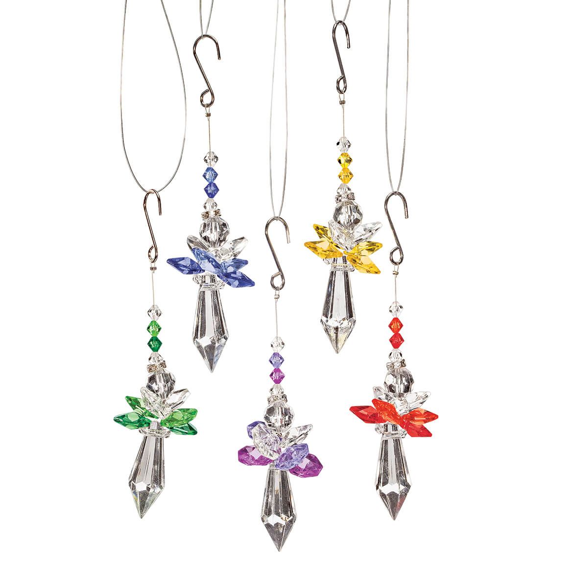 - Add a sparkly, angelic accent to your Christmas tree or window with these beautiful crystal angel ornaments. Designed with a retro beaded angel ornament look and decorative crystal bling, they're perfect for displaying at Christmas or all year long. Light catches on the facets for a pretty effect. Set of 5 different colors. Includes hanging hooks. Measures 4 3/4" x 1 1/8" x 2/3".