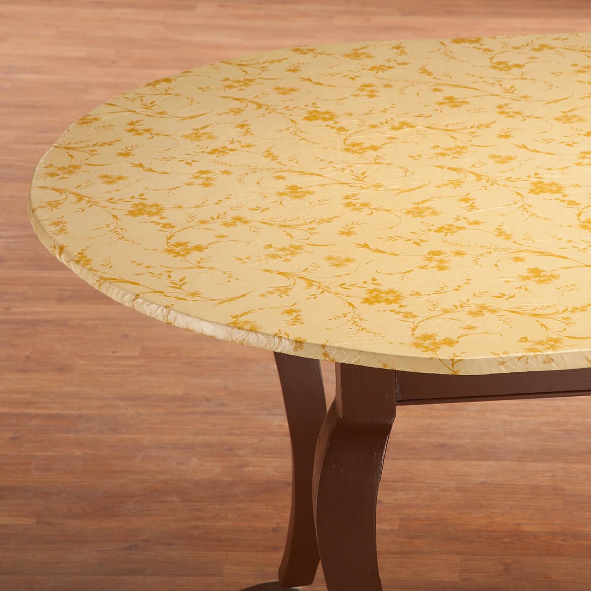- Pretty floral swirl elasticized table covers have the elegance you love without the fuss, in easy-care vinyl! Elasticized table covers stay in place neatly with fleece backing and elasticized edges. Simply wipe clean with sponge or damp cloth. Bring an older patio table back to life with this beautiful cover solution that transforms an ordinary glass or plastic table into a stunning showpiece. This durable vinyl tablecloth features an intricate floral design over a matching background to add warmth to your indoor and outdoor dining spaces. The intelligent design fits flawlessly over a round or oval table and gives your table a seamless flat surface. Plus, this new and improved design gives you 3 colors and 3 different sizes to choose from to enhance your existing décor and fit your particular table measurements. Select your favorite from green, blue, or yellow to brighten your space. The fleece backing provides added cushion to prevent scratching on glass tables and minimize dents from heavy dishes on wooden surfaces. Impress visitors at your next event or dinner party with this floral swirl vinyl, elasticized table cover. Small round floral table cover fits 40"-44"dia., large round fits 45"-56"dia., oval fits tables up to 42" to 68". Imported.