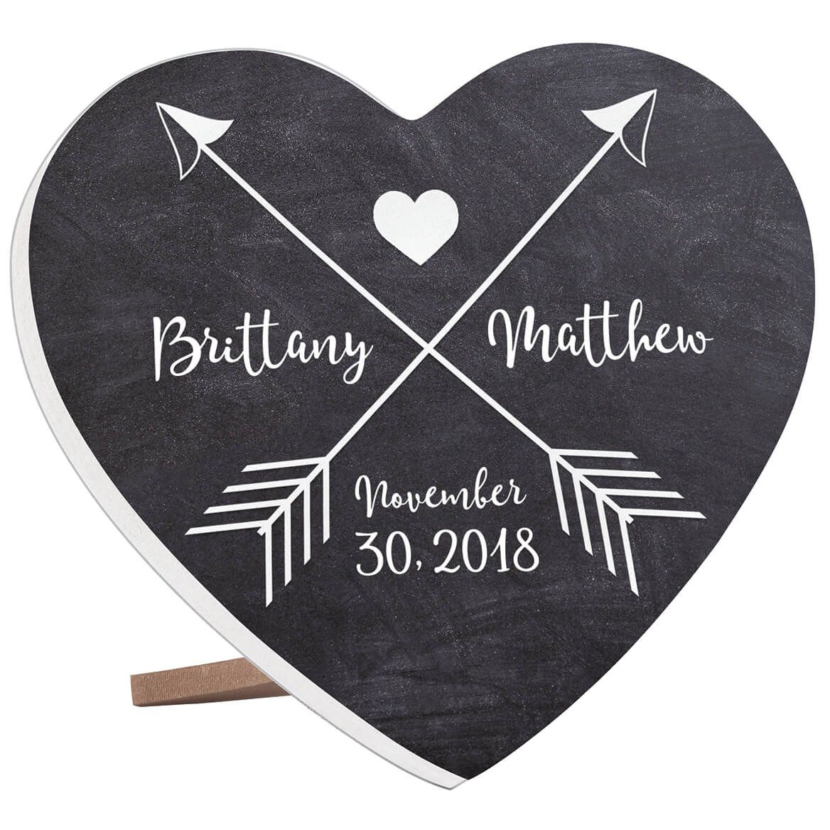 As a wedding gift, anniversary gift or just because, our Personalized Arrow Heart Table Sitter Decoration will be welcomed. This thoughtful décor features a modern design with intersecting arrows that represent paths that cross. Customize this unique table decoration for a heartfelt gift that is one of a kind. They’re sure to cherish it for the rest of their lives! Add to a shelf, a mantle, a desk or a bedside stand: this table sitter gift has a built-in easel that makes setting it up quick and easy.