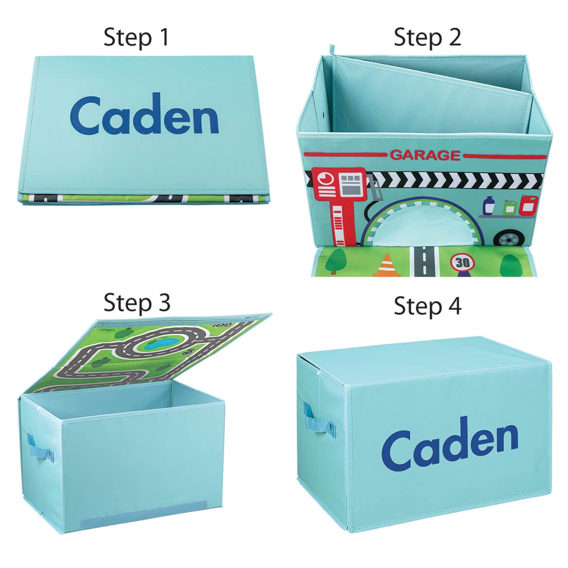 - Multipurpose toy chest encourages imaginative play and offers a quick cleanup solution when playtime is done! Toy bin is perfect for keeping toys within reach but still out of the way. Sturdy storage bin provides ample space to organize toys, books, clothes, shoes, craft supplies and other clutter. Classic design features a secure lid with hook-and-loop closure. Simply unfold the lid of the toy chest to reveal a colorful play mat. Toy mat features a windy road among trees and ponds, all leading up to a 6 3/4" x 3 3/4" opening to the "garage" for safe keeping. Fold-out mat can be configured in multiple ways for endless hours of fun. Foldable toy chest is easy to setup and collapses for space-saving storage when not in use. Lightweight chest features double handles in a strong woven material, making it easy to move the storage box from room to room. Storage bin makes a wonderful gift on its own or as basket filled with additional toys for a birthday, Christmas or Easter. Make the magical storage box extra special by adding the name of one lucky child. Specify name, limit 12 letters. Non-woven sturdy fabric/cardboard. Wipe clean with damp cloth as needed. 10" x 15" x 9 3/4". Toys cars NOT included.