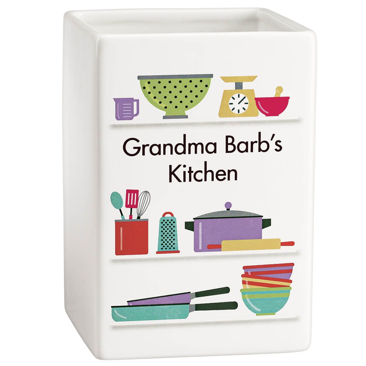 - Add a touch of personal charm to any kitchen with this Personalized Kitchen Design Square Crock. Featuring colorful art dedicated to the tools that help create memorable meals, there's also space to personalize up to 2 lines. Perfect for serving treats or organizing utensils, and it makes a great gift! Choose from 4 font colors to complement any décor: black, blue, red or green. Specify name/message; limit 2 lines, 16 characters each. 4 3/4" sq. x 7" high. Hand wash.