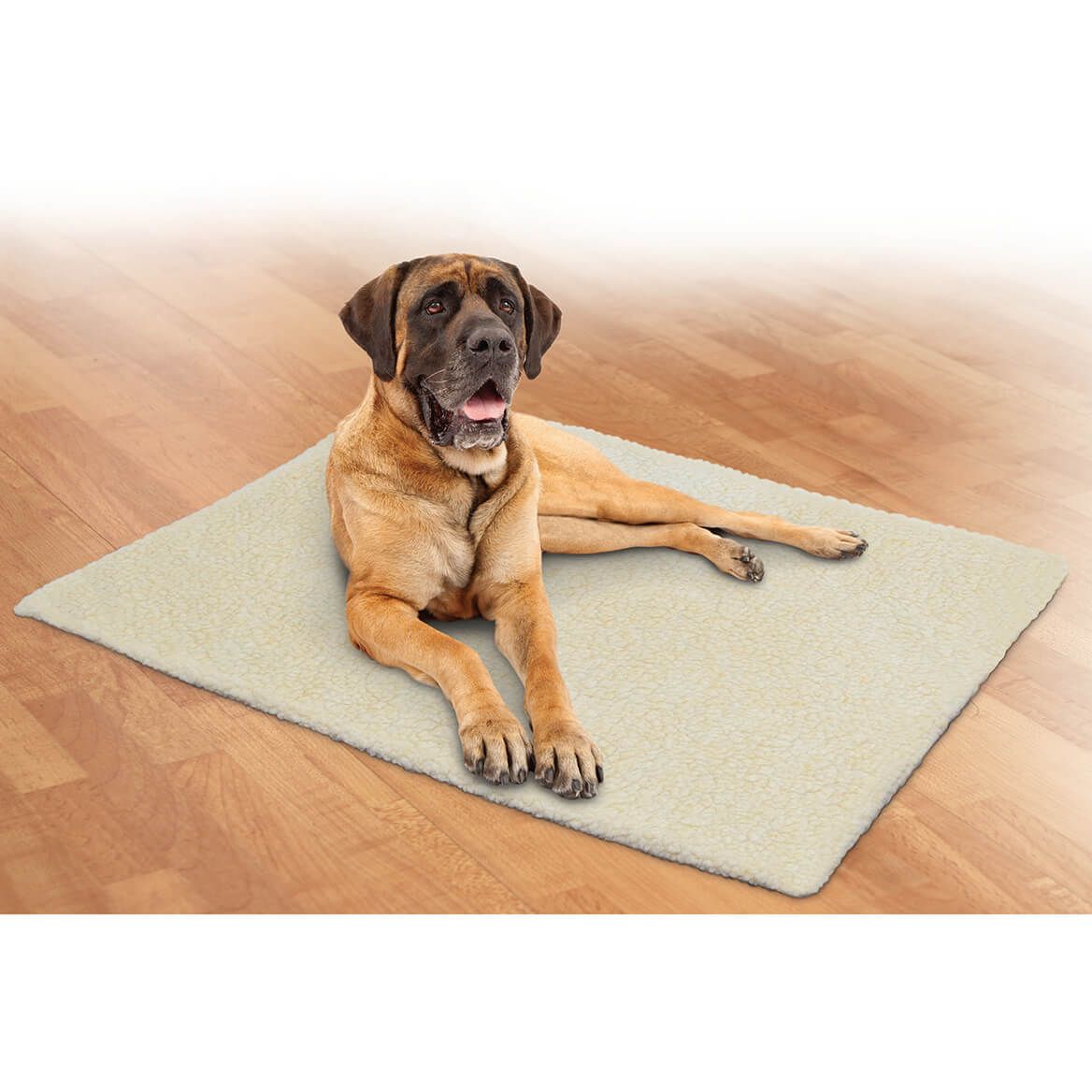 - With a thermo-reflective layer that radiates your pet’s body heat back to him, this self-warming pet blanket provides constant, comforting warmth. Naturally warming without cords, electricity or worry, unique 4-layer construction includes plush, washable fleece on top, thermal insulation, heat reflecting layer and non-slip base. Safe and convenient for crate, cage or floor, this self-warming blanket is perfect for pets of all ages, and especially comforting for seniors. 55% polyester/35% aluminum/10% PVC. Large: 40" long x 30" wide. Small: 26" long x 19" wide.
