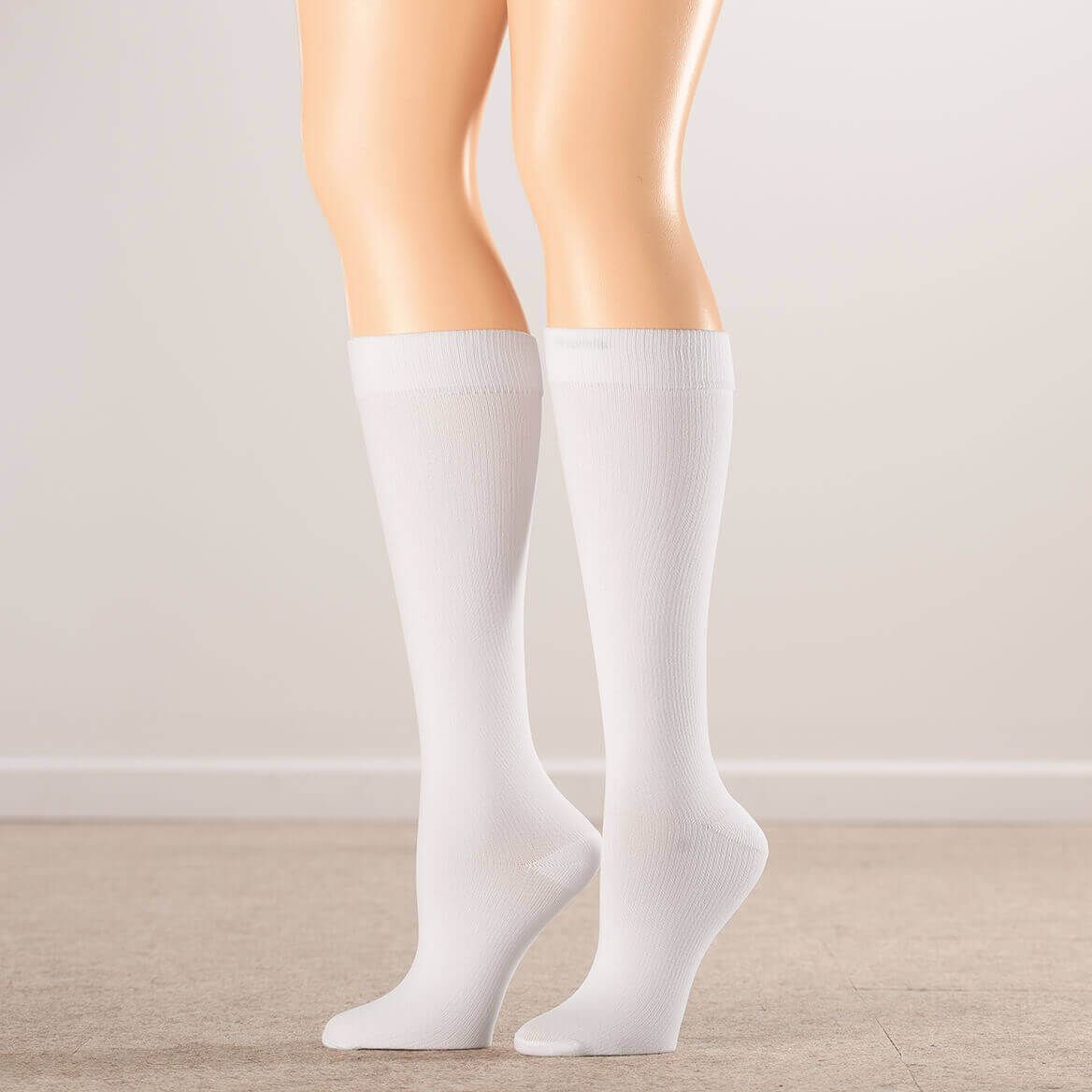 - These Silver Steps™ compression socks are designed to help relieve tired or aching legs, mild swelling and discomfort from spider veins. Perfect for everyday wear at home or on the go, the 20-30 mmHg calf compression socks help encourage healthy circulation. Specify color. Specify size. 82% nylon/18% spandex. Machine wash. Made in USA.