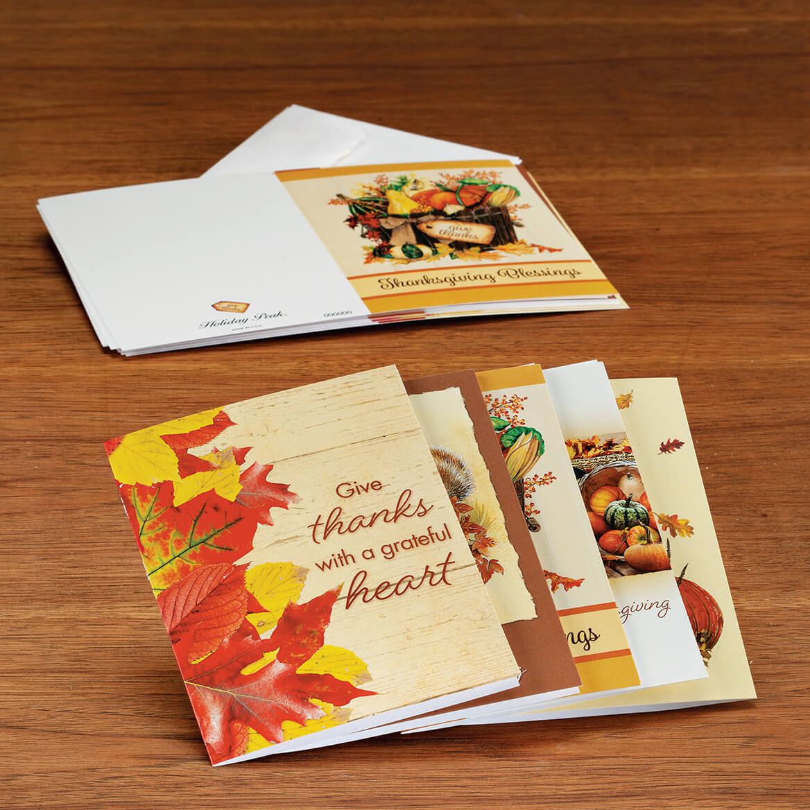 - Thanksgiving is a great time to send a personal greeting, and these assorted Thanksgiving cards make it easy to connect with friends and loved ones before the hectic holiday rush. Wishing "Happy Thanksgiving" in artful style only found here, the set of 20 holiday cards includes 4 each of 5 unique designs with warm sentiments you'll be proud to share. The quality assortment of Thanksgiving cards makes it easy to show your thoughtfulness. Includes 20 envelopes. 4 1/8” x 5 3/8”.